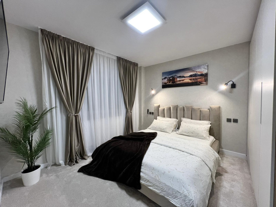 Dormitorul este gândit ca un refugiu intim, creat pentru odihnă profundă și atmosferă caldă. Mochetă de înaltă calitate, importată, acoperă întreaga zonă și îi conferă un confort tactil aparte.